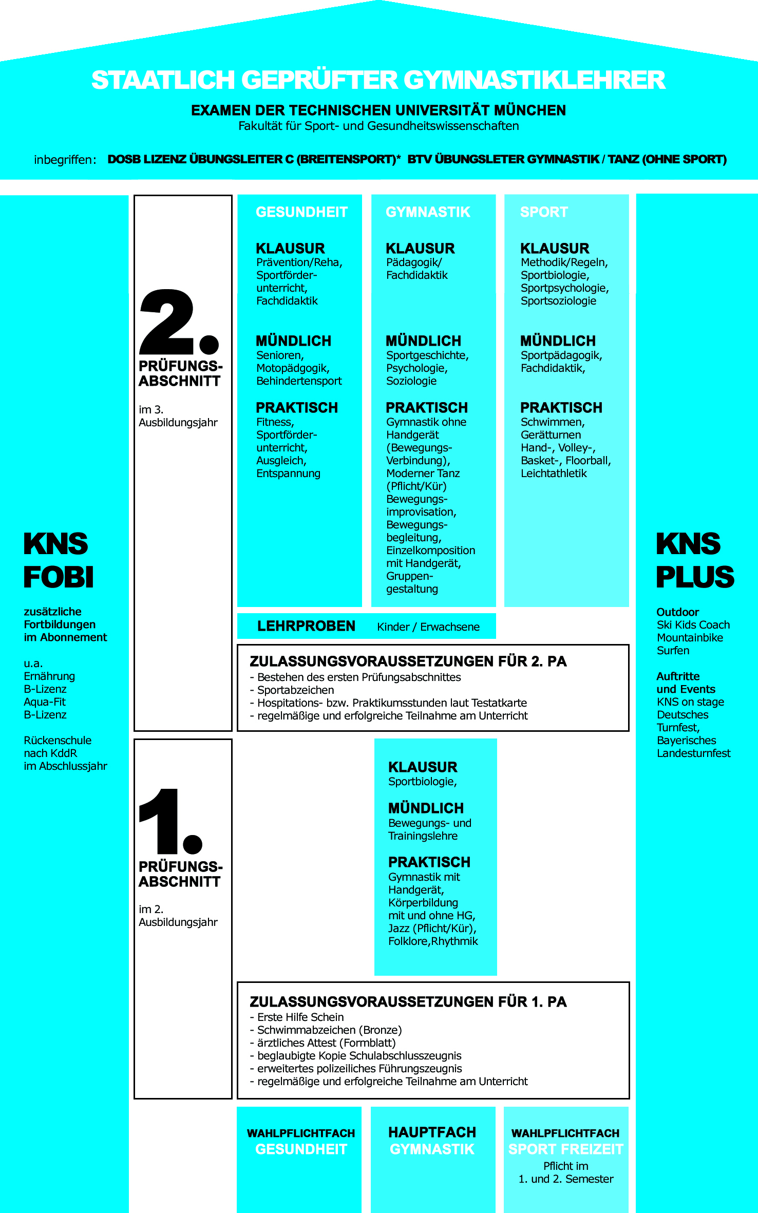 In drei Jahren machen wir dich in München zum/r staatlich geprüften Gymnastiklehrer*in und damit zu einem Experten auf den vier Gebieten Fitness, Sport, Tanz und Gesundheit. Deinen erfolgreichen Abschluss und die Aussicht auf ein erfolgreiches Arbeitsleben baust du auf fünf Säulen auf. Neben dem Hauptfach Gymnastik und den beiden Wahlpflichtfächern Gesundheit und Sport Freizeit bereiten dich das KNS Fortbildungs-Abo sowie das KNS Plus auf die beruflichen Herausforderungen optimal vor. Hier erhältst du einen Überblick über den gesamten Weg, den du mit uns zurücklegst.